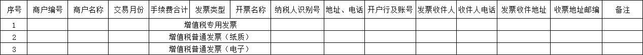 一、每月10日,通过线下流程进行处理,联系商务经理申请。二、发票邮寄地址,仅支持邮寄至服务商,不支持邮寄商户。附件附件1:商户手续费发票申请表.xlsx文档更新时间: 2024-01-13 16:17 作者:康飞