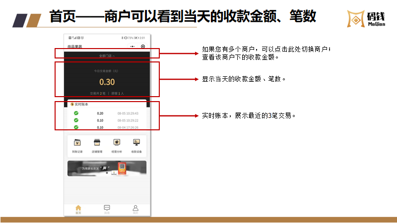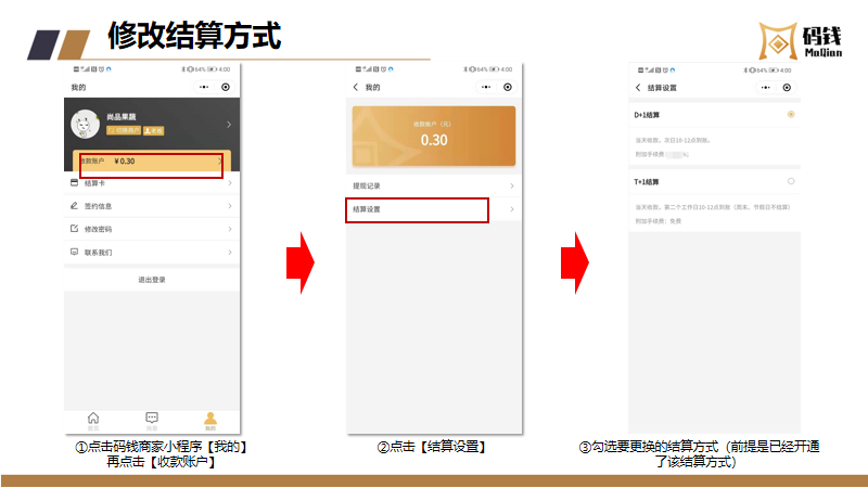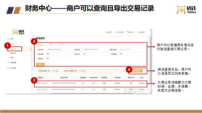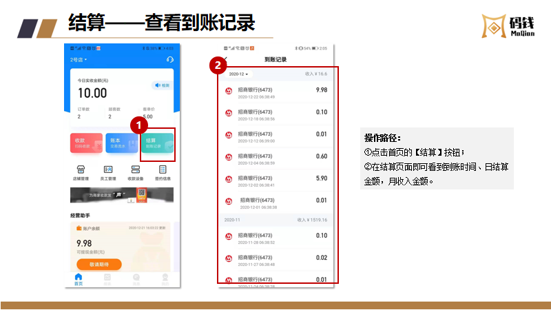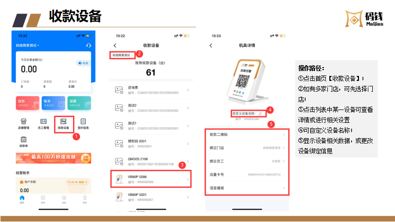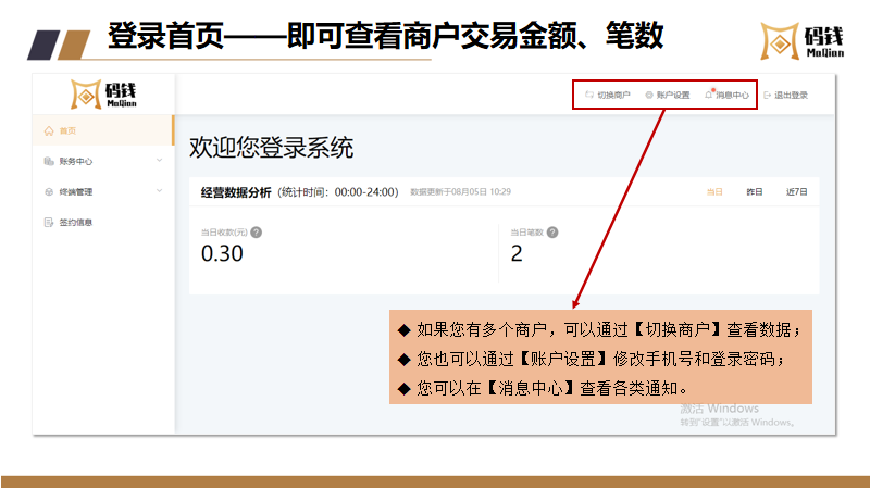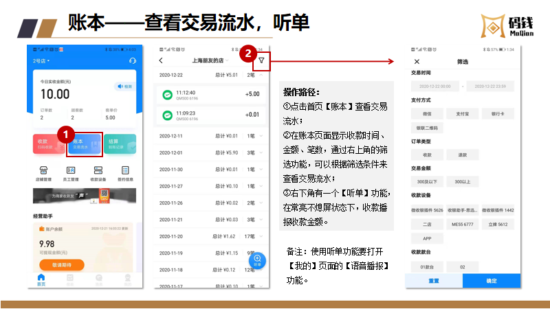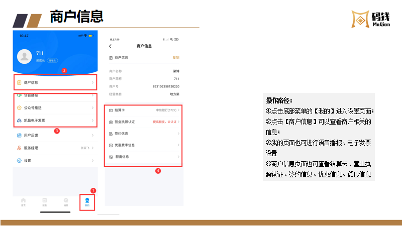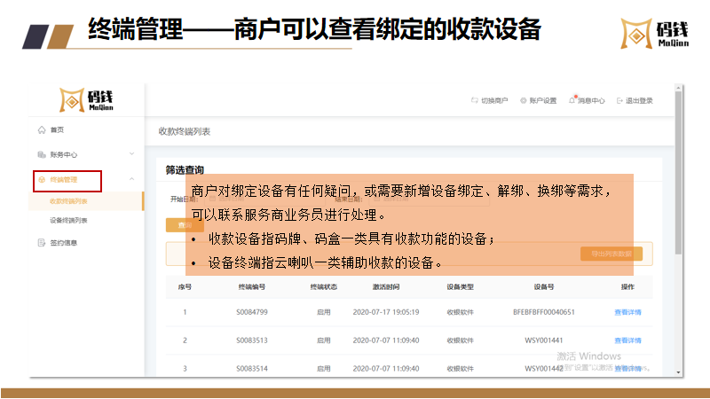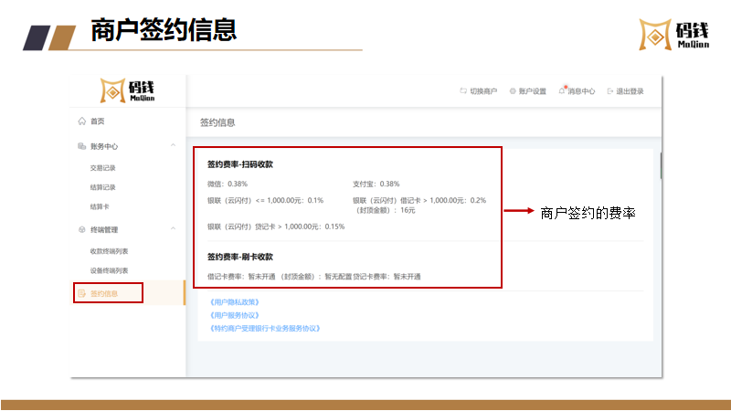 目录 搜索 服务商接入服务商接入流程及说明服务商入网流程微信/支付宝渠道号申请收单外包机构备案指引【盖章流程】中国银行行业码 (主扫JS支付)业务申请业务运营指引商户进件资料规范说明微信、支付宝认证指引终端入网申请流程结算卡变更申请流程商户退汇处理流程商户提额流程商户同营业执照多次入网申请修改商户的微信结算id商户手续费发票申请流程终端采购发票申请流程微信商户意愿确认常见问题--官方版本码钱运营Q&A风控管理风控工单申诉指引微信商家自助申诉操作指引支付宝准入申诉支付宝商家自助申诉指引服务商分润平台操作指引码钱平台——服务商操作指南码钱平台——商家操作指南(商户使用版)硬件设备介绍及相关指引码钱平台——服务商终端采购指南终端型号介绍及价格 暂无相关搜索结果! 码钱平台——商家操作指南(商户使用版) 文档更新时间: 2024-02-23 17:27 作者:康飞