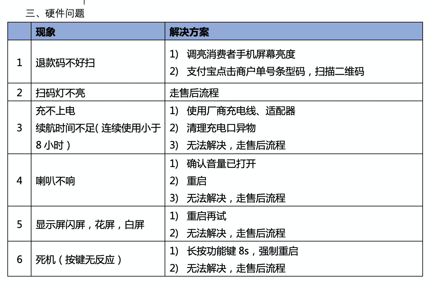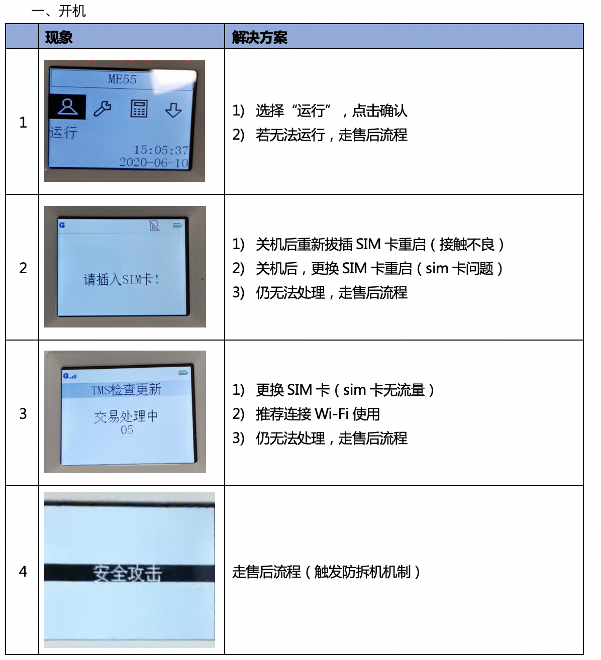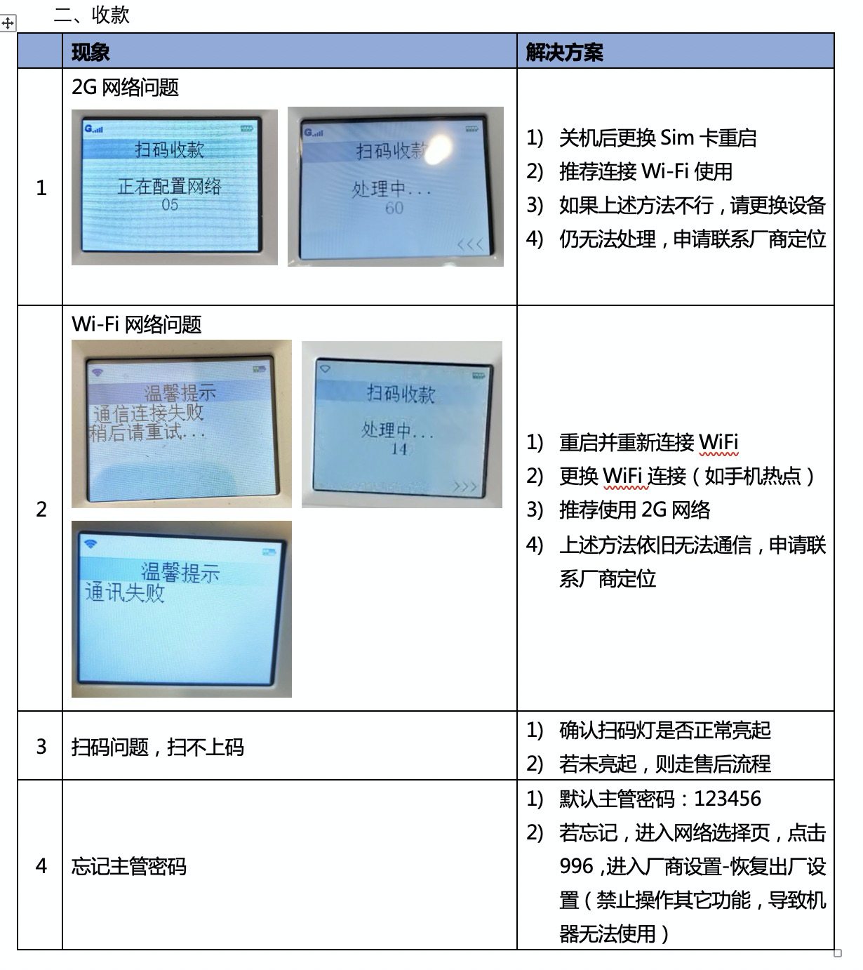 版本:20200729 非常见问题,需提供以下信息:1.设备SN、商户号2.软件版本号 1、开机常见问题及解决办法2、收款常见问题及解决办法3、硬件问题及解决办法文档更新时间: 2020-10-27 14:33 作者:王宁