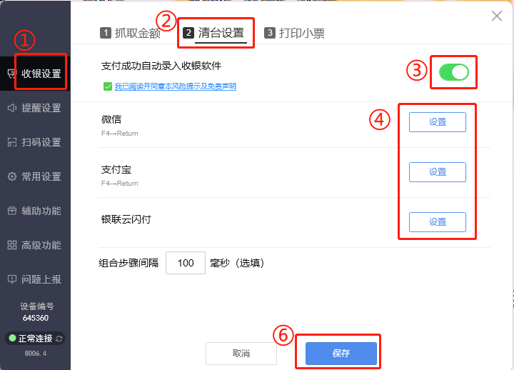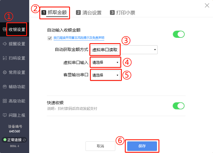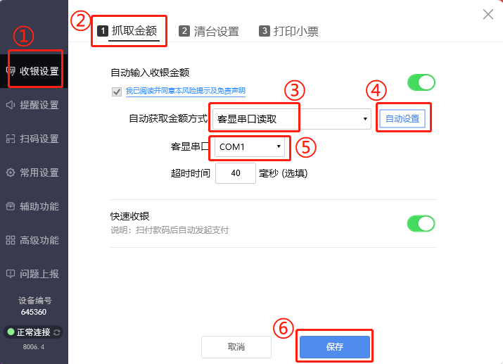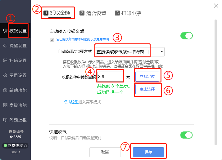 如下图所示,在收银设置界面,抓取金额方式选择直接读取收银软件结账窗口;