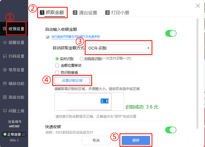 如下图所示,在收银设置界面,抓取金额方式选择OCR-识别;