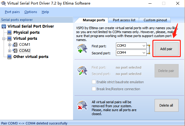 首先要安装虚拟串口工具,并生成一组虚拟端口,如下图所示;