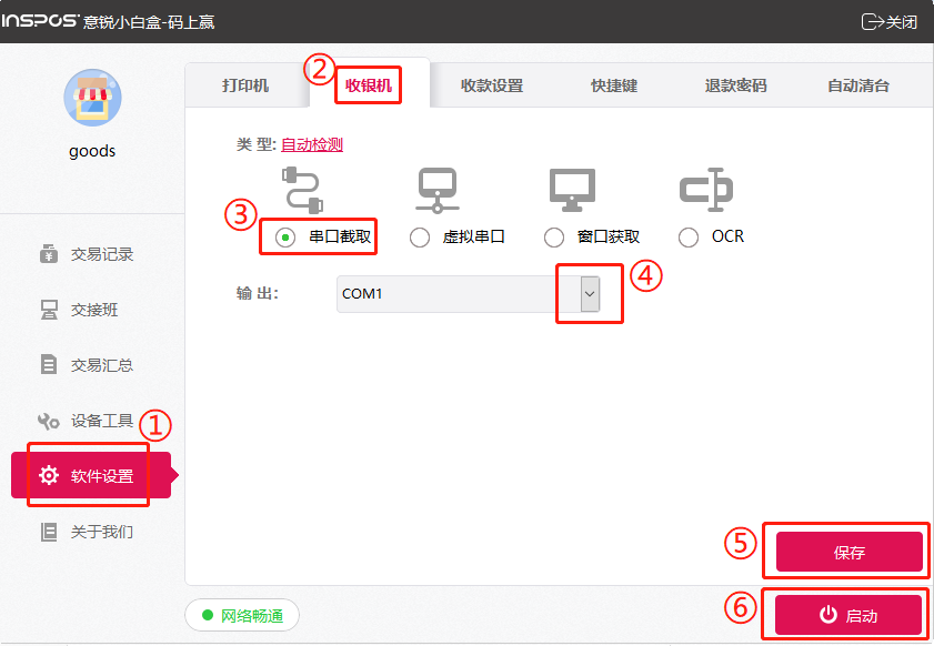 如下图所示,在软件设置里找到收银机,选择串口截取;