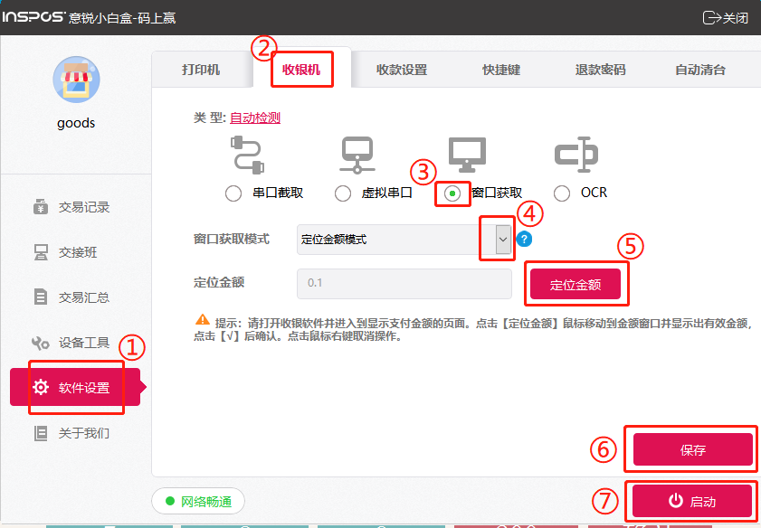 点击保存,再点击启动,测试录入商品,看悬浮窗口显示的金额是否准确无误。