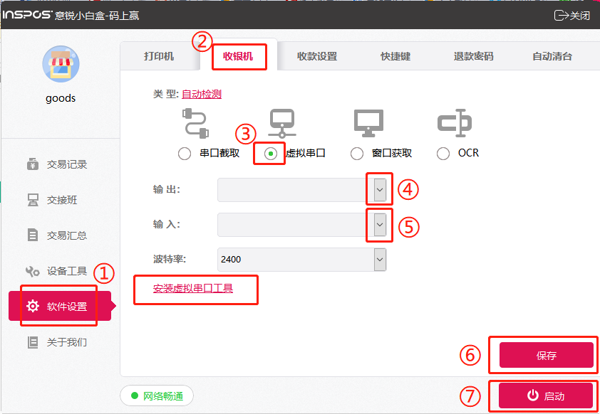 如下图所示,在软件设置里找到收银机,选择虚拟串口;
