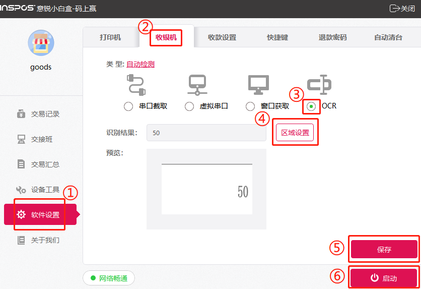 点击【区域设置】,将截取位置设置在结算金额处,双击确认,看下识别结果是否正确,准确无误后点击保存,再点击启动,测试录入商品,看悬浮窗口显示的金额是否准确无误。